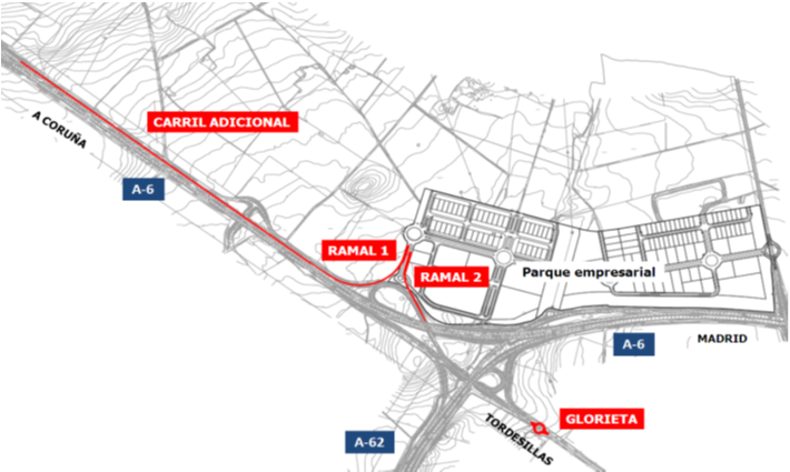 Las obras consisten en la ejecución de dos nuevos ramales, que permitirán la conexión de la actual “Glorieta de acceso” al polígono con la “Variante de la A-6” a su paso por el municipio de Tordesillas y la “A-62.