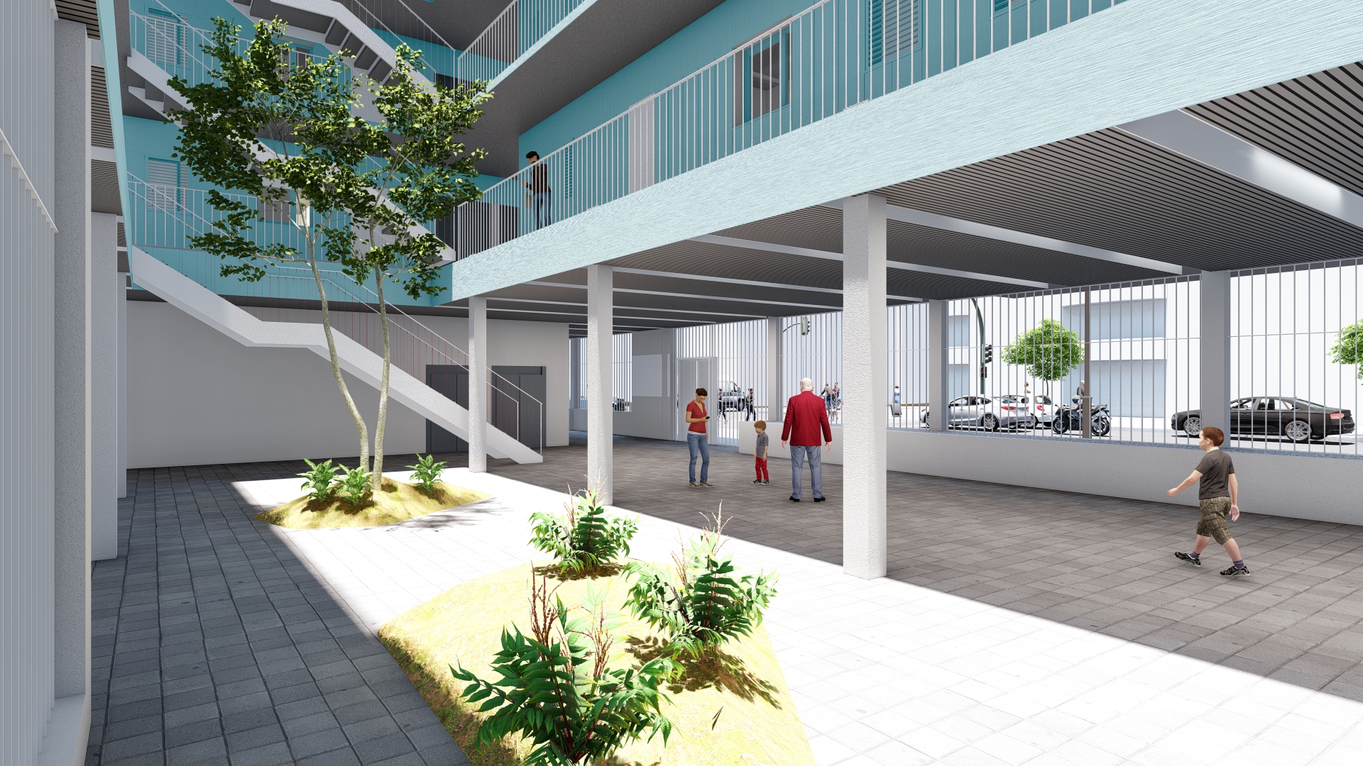 Los espacios comunes conformarán el eje central de la vida comunitaria, cobrando especial relevancia la distribución de las viviendas alrededor de un patio central, mejorando así la accesibilidad y la conexión entre espacios privados y áreas comunes.